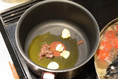 冷たいフライパンにオリーブオイルを回し入れ、ニンニクのスライスを入れ、火にかけます。