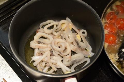 焼き色が付いてきたら、ミニトマト、ケーパー、アンチョビフィレを入れて炒めます。