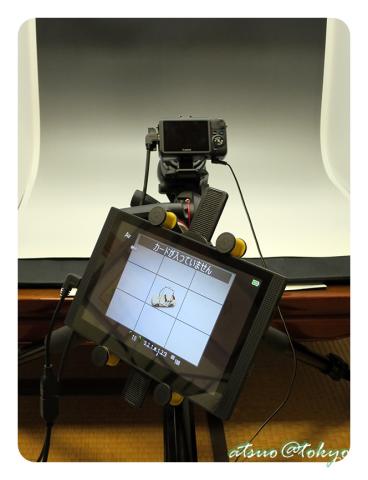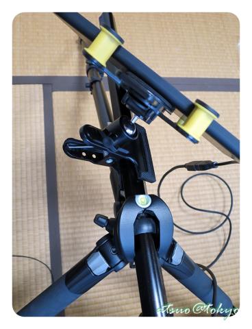 机上ではこのセットが良いのですが、ブツ撮りしているカメラに接続するには設置スペースの関係上カメラを載せている三脚に取り付けるのが良さそうのなので、仮設置ですが次のクリップ式スタンドを利用し設置してみました。