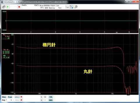 楕円針 1KHz再生時の高調波 高次高調波が若干少ないかも? 針の構造で歪が少ない?