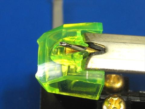 上画像は右側、下画像も右側が削られているので楕円針と判ります(レコード溝に沿って前後)