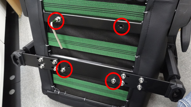 まずは、背もたれの横に最初からくっついてるネジを六角レンチ大で外します。左右2カ所ずつ4か所外します。