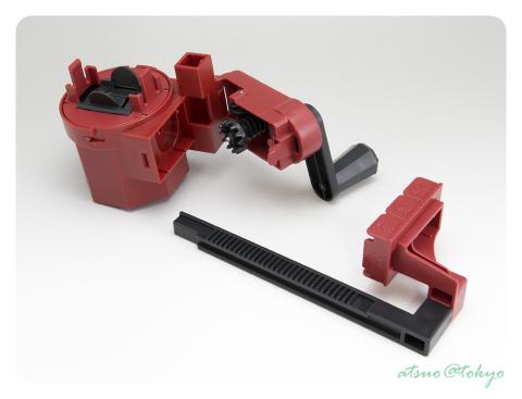 ハンドルを回す事で、カッターを回すギアとあずきバーをゆっくり押し込んでいくネジ式歯車が回転します。