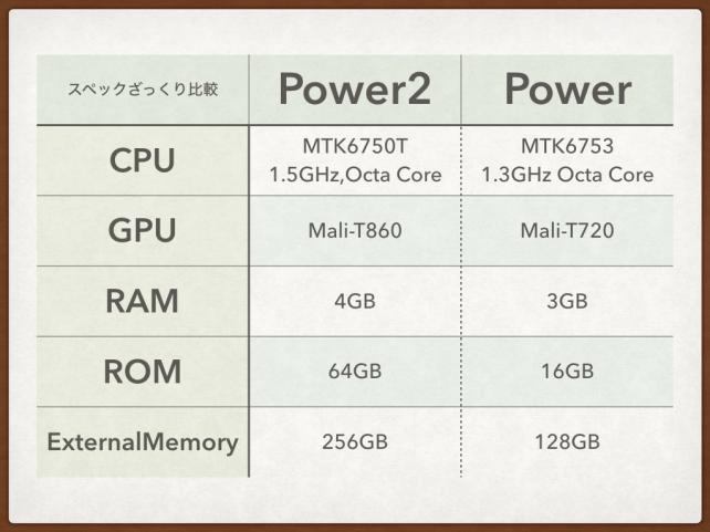 MT6750T 1.5GHzのオクタコア(8コア)で、初代のPowerのほぼ後継といっていいCPUで、無難にバージョンアップを果たしている。メモリも3GBから4GBへ、ストレージは大幅アップの16GBから64GBへと、これらの性能も同様に順調にアップしています。