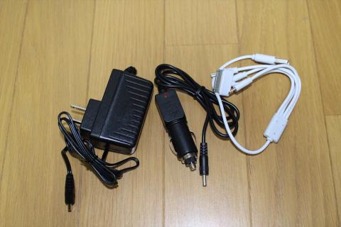 モバイルバッテリーとして使うUSBケーブル、カーチャージャー、家庭用電源アダプタが付属しています。