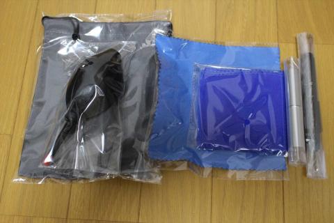 ブロアー、ダストブラシ、レンズペン、クロスが2種類、収納袋の6点セットです。