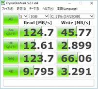 Crystal Disk Markでベンチマークを取ってみましたが、最近のeMMCと比較すると、スピードはやや遅めです。