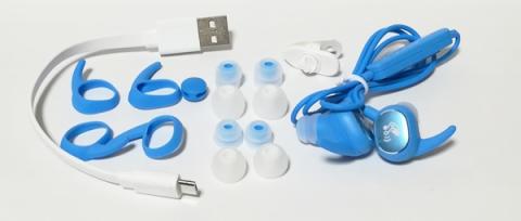 ハードケースを開けるとイヤホン本体と充電用USBケーブル、たくさんのイヤーピースとイヤーフック、クリップがあります。