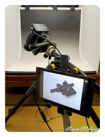 ブツ撮り時には、マンフロットの三脚に載せて撮影画像を確認しています。