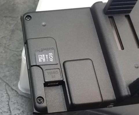 裏側にわ、SDカードのスロット(4GBのメモリーカード付)にドライブレコーダーの接続口、電源接続穴などがある。