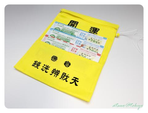 はじめ神社の売り場では巾着を購入しようと思ったのですが、以前に宝くじを銭洗弁財天の財布に入れているのをテレビで見たのを思い出し、サイズの大きい本品を購入する事にしました。