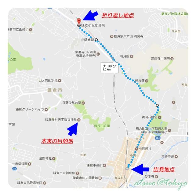 当時の記憶を辿ると、鎌倉駅近くの駐車場に車を停めて小町通りを抜け、鶴岡八幡宮の横を通る車道脇をひたすら歩き、JRの隣駅である「北鎌倉駅」を過ぎ郵便局を過ぎた辺りで諦めて引き返しました。