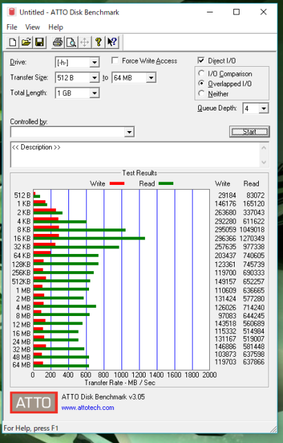 ATTOで見てみると最も読み込み速度が出ているのは 16KB付近だけで、それ以外は600MB/s前後の速度に落ちている。