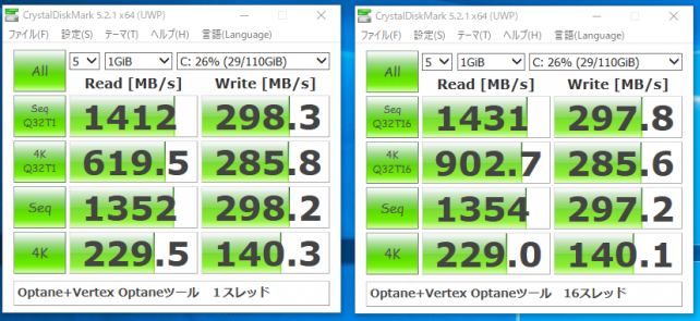 Intel®Optane+Vertex を Optaneツールでインストールした方は、Readの16スレッドになると4LQ32T16が約1.5倍高速になった。