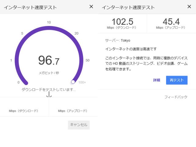 スピードテストをしてみましたが、アップロードが45Mbps , ダウンロードが102Mbpsと決して速くはありませんが、普段はギガビットイーサで繋いで、良しとします。