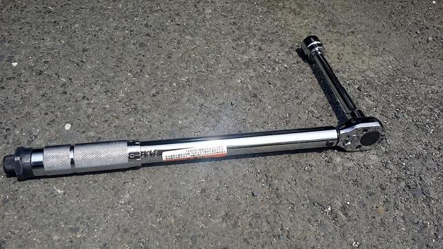 トルクレンチを持っていない場合、純正のレンチは大体端っこの方を持って50kgの体重を掛けると規定締め付けトルクになるような調整をしているハズなので上手く調整をしてみると良いだろう。