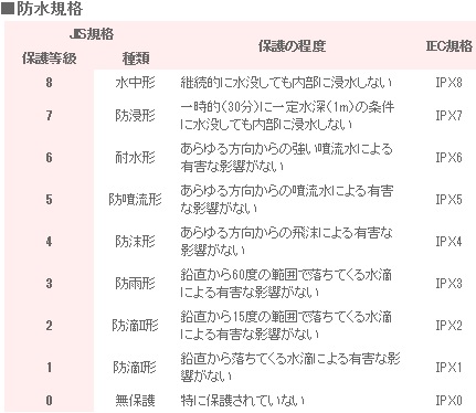 防水5級は「あらゆる方向からの噴流水による有害な影響がない」で、最上位は8級です。なお生活防水は4級以下で完全防水は5級以上らしいです。