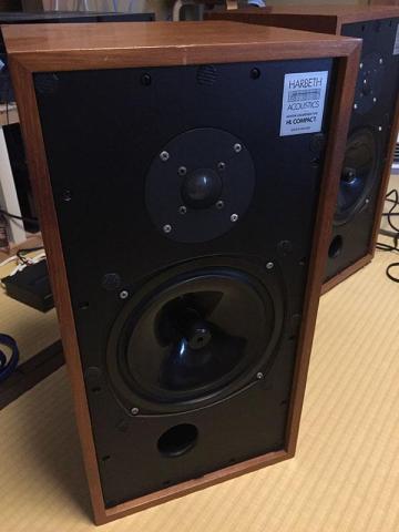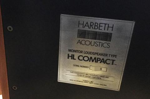 そして本当の隅の方に置かれていたこのスピーカーに目がとまりました。サランネットがなかったことから、振動板が安っぽい樹脂製に見えたのですが、銘板をよく見ると「HARBETH ACOUSTICS HL COMPACT」の文字が見えるのです。それがS-77TWINよりも安く売られていました。