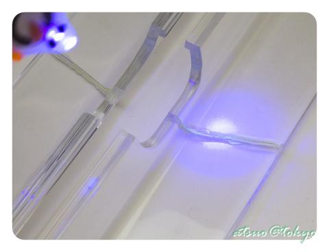 面白い使い方としては、UVライトさえ当てられれば水の中でも硬化するので、水の入った水槽内でも接着が可能です。
