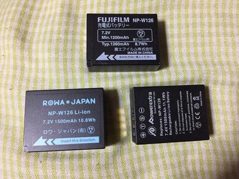 私が軽装備撮影時に主に使うミラーレス一眼カメラのFUJIFILM X-E2。本体購入時に添付されていた純正バッテリー、NP-W126の1本以外は、格安互換バッテリーを利用しています。