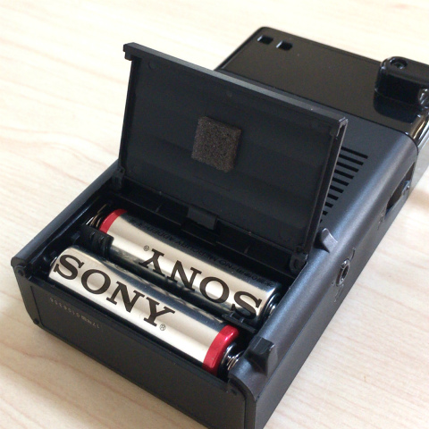 大きさ(幅×高さ×奥行):約69.5×119×38mm(突起部含む)、質量:約180g(乾電池、イヤホン含む)