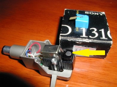 上の針が下画の処にジョイントします 黄色い矢印先はマグネットです マグネットの磁束がレコード針の音楽で振動したカンチレバーを経由してカートリッジ内部のコイルに伝達され発電します MM型のカンチレバー根元に付いているマグネットが黄色い矢印に移っただけの事ですがこれでIM型としてSHURE社の特許回避してます マグネット振動で発電するのはみな同じなんですが種類が多いです