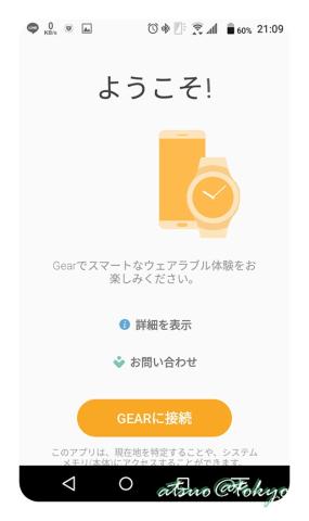 再度「Gear Manager」アプリを起動する事で、「ようこそ!」画面が表示され