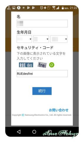 個人情報項目をすべて入力し、最後に表示されているセキュリティ・コードを入力し[続行]をタップ