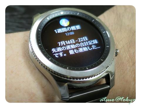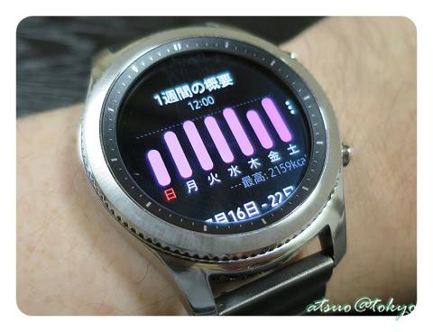Gear S3では標準で歩数や消費カロリー、活動時間、睡眠時間など自動収集しており、それらを一週間分をまとめて通知してくれます。
