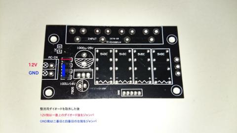 デフォルトではAC電源を要求しますが、基板上の整流ダイオードを取っ払って、7805にDC12Vを直接印加してやることに。