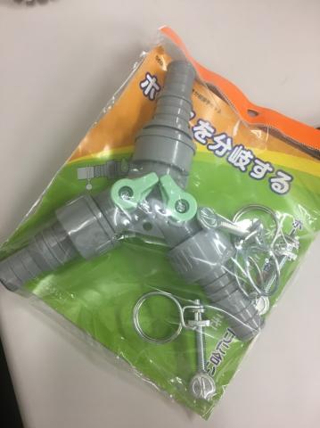 分岐するアダプタと、ホースを留める金具が3つセットになっています。