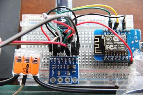 I2Cで出力されたデータは、ESP8266の開発ボード(ESP8266MOD = ESP-12E とシリアルチップ CH340G 搭載の D1 mini V1、ArduinoIDEを使用するとポートに制約あるもののArduinoとプログラム互換あり)で受け取り、