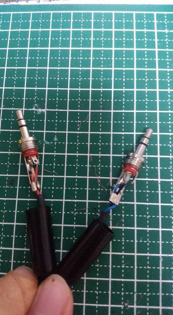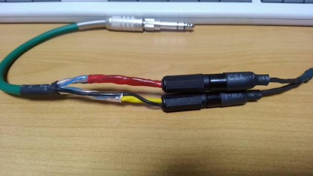 以前、中途半端に余ったモガミのNEGLEX2534と60円の格安ジャックとカナレのF-12ステレオプラグで変換ケーブル(3極ジャックx2⇔ステレオミニ)を作ってあったのでコレで使えるようにしました。