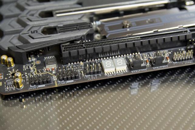 PCI-Eスロット周りにも、スロット番号が記載されたパーツがはまっていて、下位モデルとの差別化が図られています。