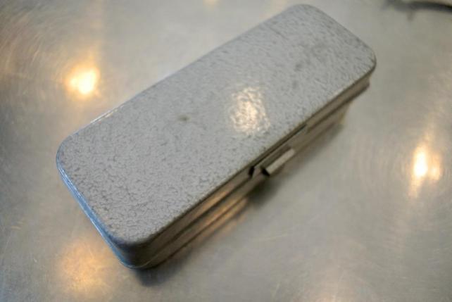 薄い金属製ケースに納まります。 ばね鋼を利用したラッチで閉まる構造です。