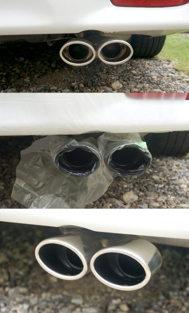 で、この正円→オーバル部分が後ろから見ると目立ってしまい、どう見てもマフラーカッターです本当にありがとうございました状態。気にしなければいいっちゃいいのだが、どうにも写真を撮るときにすら枠がマフラー(カッター)内に見えているレベルで結構目立つ。なのでごまかしごまかし!
