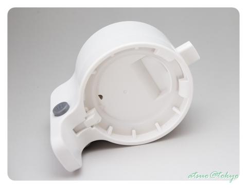 注ぎ口上部を見ると丸い凹みの真ん中に突起があり、そこに対応する上部の場所に金属プレートがあります。