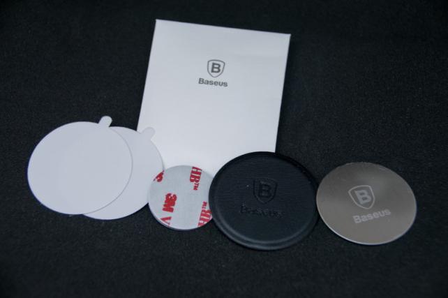 付属品はホルダー本体とシール類、1枚のメモ的な説明書のみです。付属しているシール類は、ダッシュボードなどの凹凸のある接地面用の透明シート2枚、交換用両面テープ、端末側に貼付するためのメタルシートとレザー風のシートです。