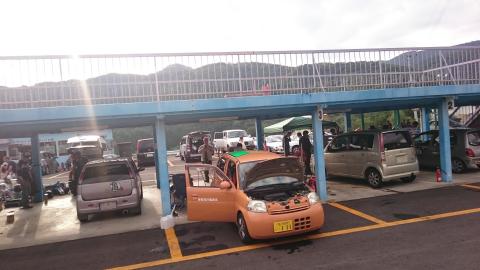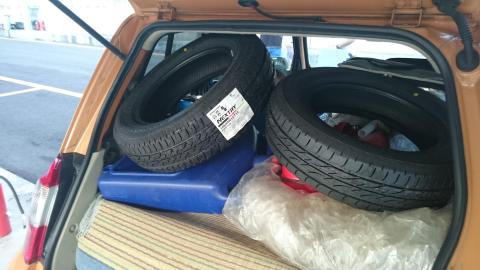 入賞で得た景品のタイヤを無理やりエッセに積み込み帰宅。