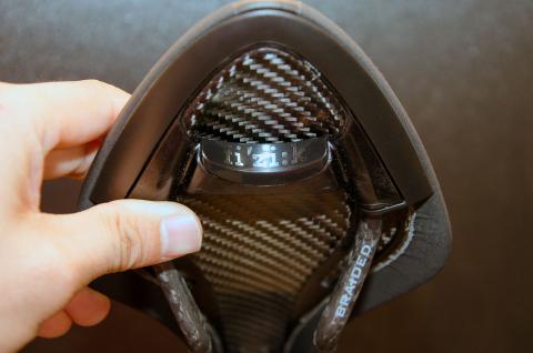 サドル後部のフィジークロゴバッジを取り外すと、そこにワンタッチでサドルバッグやフラッシングライトを取り付けられる画期的なロックシステムです。