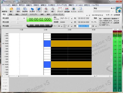 次にSoundEngine Freeで作成したWAVファイルを読み込み、0.0~2.0sec、2.3~4.0sec間を無音にします。