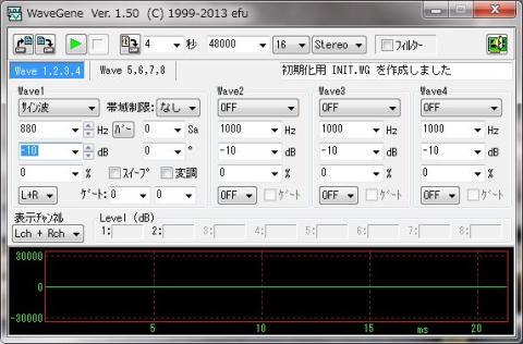 まずWaveGeneで880Hz,-10dB,4秒間のWAVファイルを作成します。