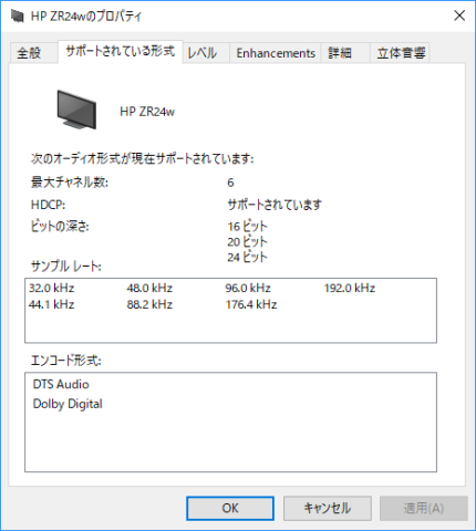 ↓の画面は、HDMI音声に対応してないhp製のモニター ZR24wをHDMI OUTに接続したときのHDMI再生デバイスのプロパティです。48kHz、24bitまで対応と表示されています。