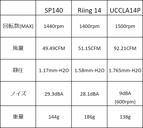 こう見るとENERMAX UCCLA14Pが最も優れていて、実際使っていてもそう感じるんですが、ここまでの数値ほどの差ははっきり言って無いですね。