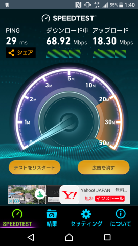最新のフラッグシップスマホだと100Mbpsを超えてきますが、これくらいのスペックのスマホであれば満足できる速度です。