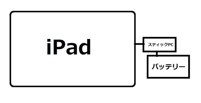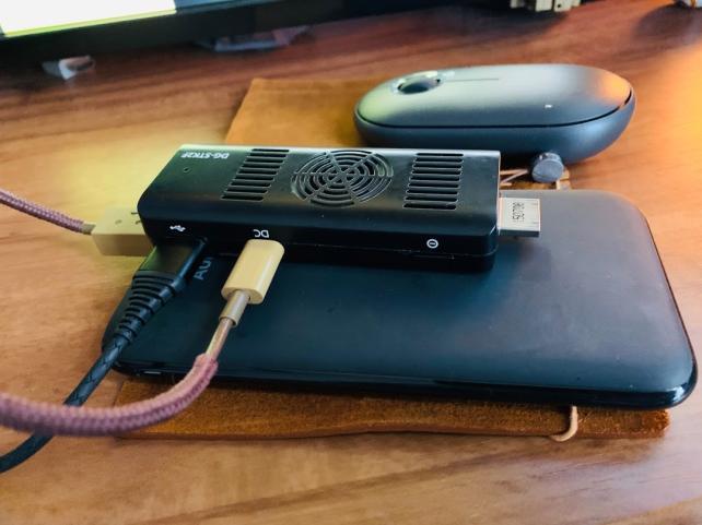 スティックPCの電源はモバイルバッテリーで、ダンボーのケーブルはスティックPCに電源供給が始まると赤から黄色にLEDがかわるのでモニタがなくても状態がわかりやすい。