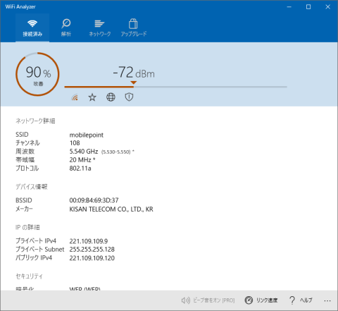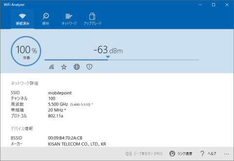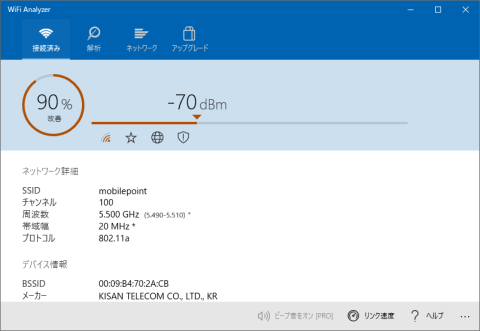 とりあえずmobilepoint(5Ghz帯)につないで、電波強度の測定です。