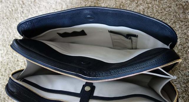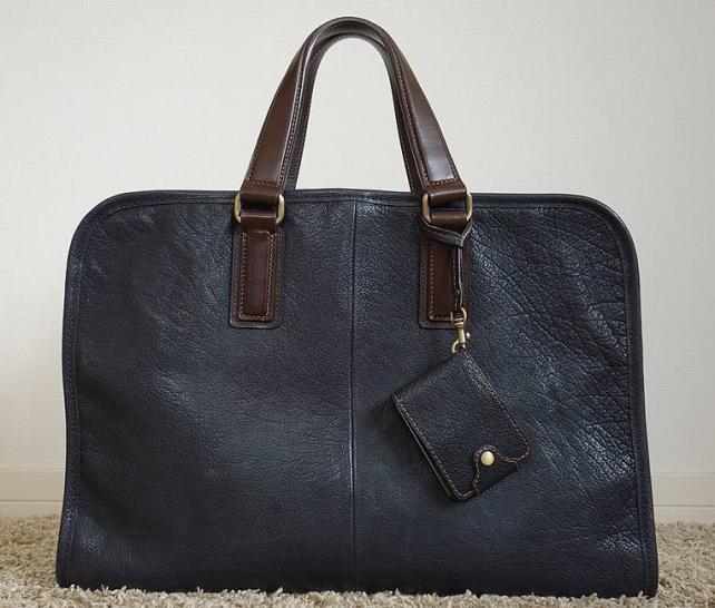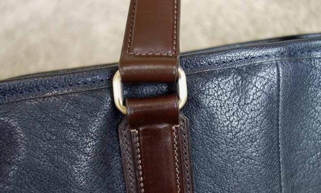 メイン素材は水牛革。水牛革に特有の大ジワからはワイルドな印象を受けるが、見た目に反して革質は柔らかくしなやか。光沢感がある仕上げがなされているので、艶やかで上品さも併せ持つ独特の雰囲気がある。色は2色あるうちからアーバンネイビーを選択。本体のネイビー、持ち手のブラウン、金具のゴールドの配色が絶妙だ。