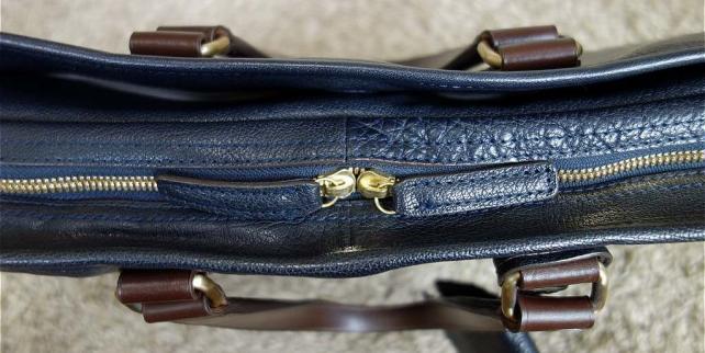 スライダー部分は革引手。スライダーとファスナーにはサティーナ加工が施されておらず、やや色目が異なる。