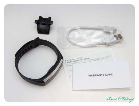 本体の他、充電台、充電ケーブル(USB-microUSB)、WARRANTY CARD(10か国語対応の保証についての小冊子)、クイックスタートガイド(日本語)が添付してきました。